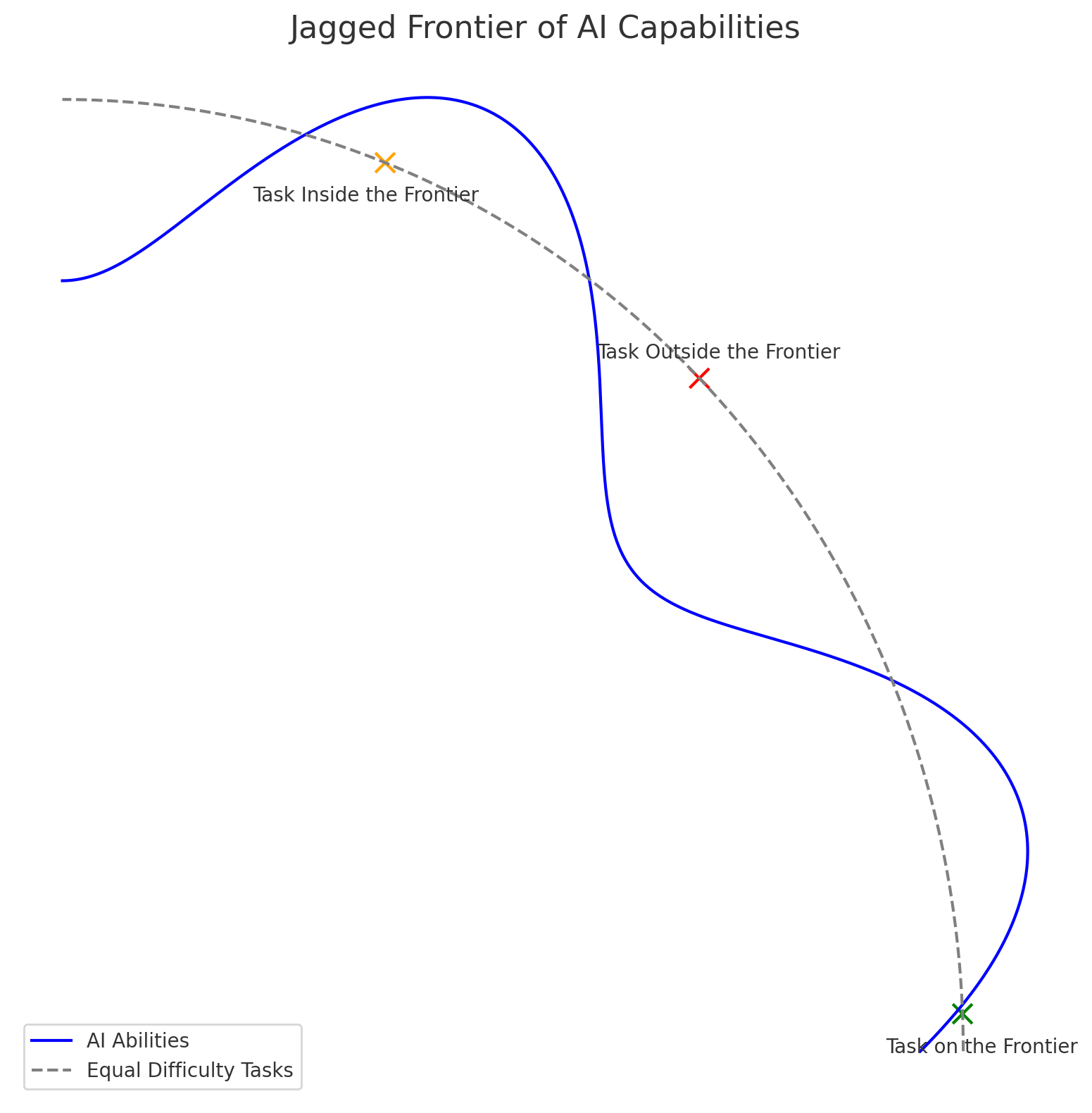 La curva azul representa las capacidades actuales de la inteligencia artificial. La línea gris punteada representa tareas que tienen una dificultad similar para los humanos. Lo interesante es que ambas curvas no coinciden perfectamente.